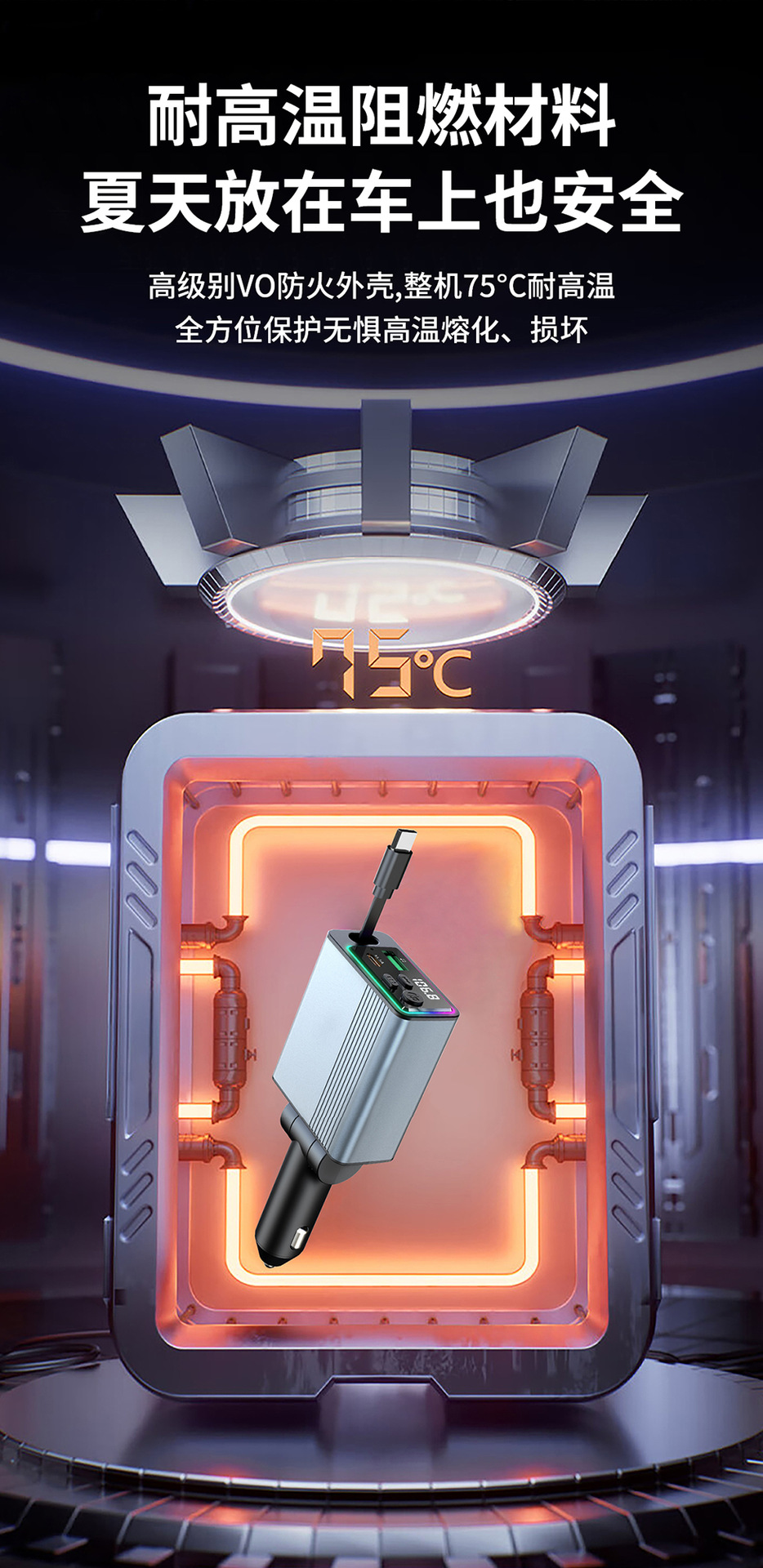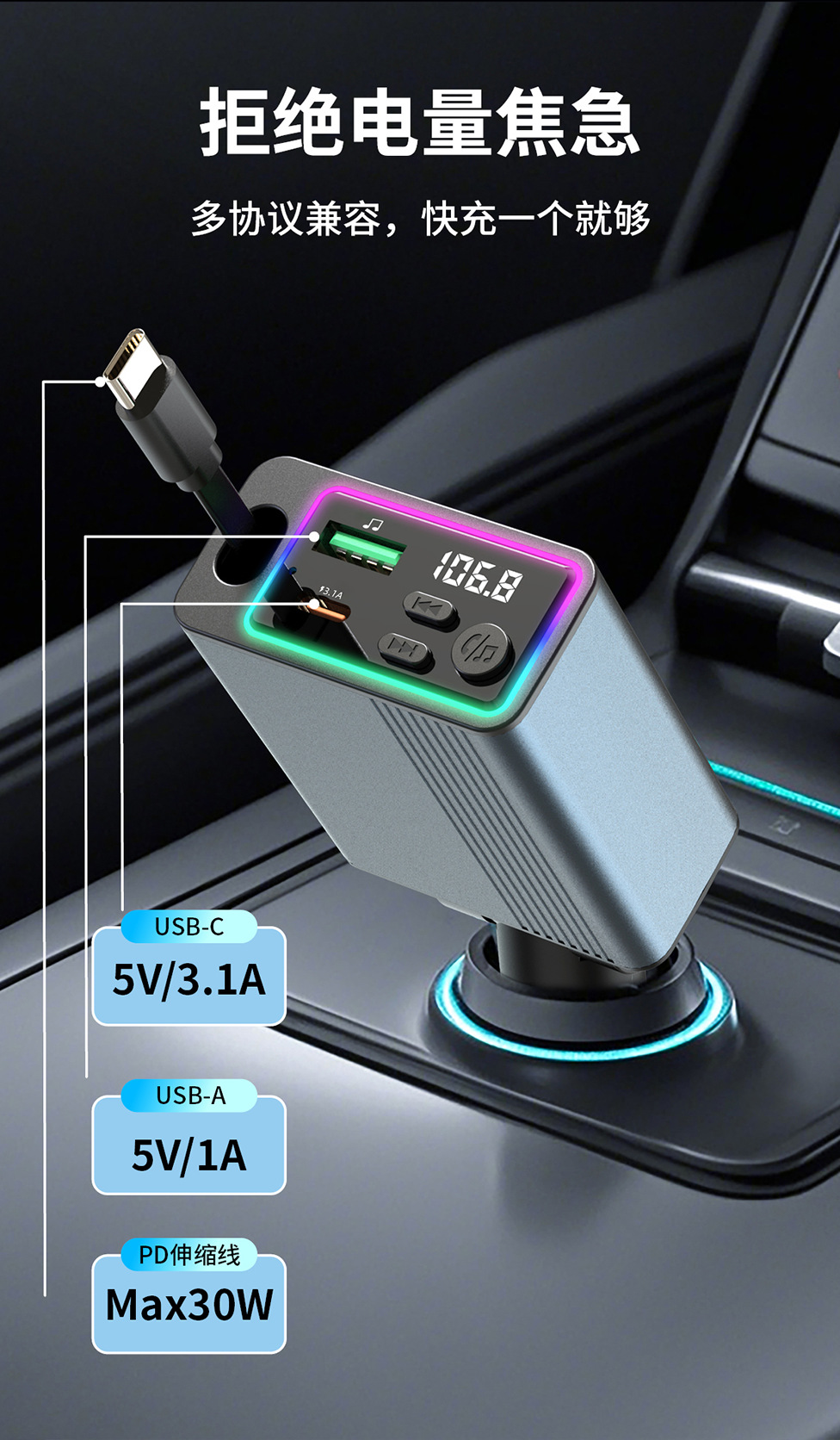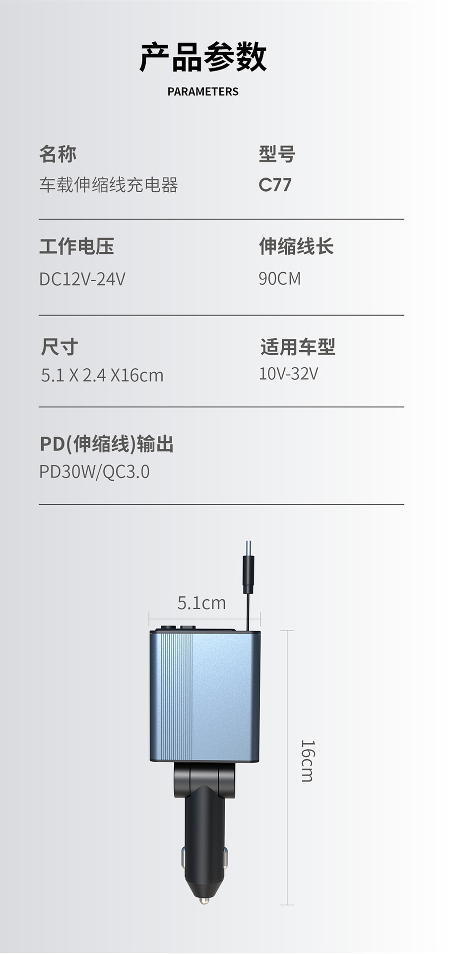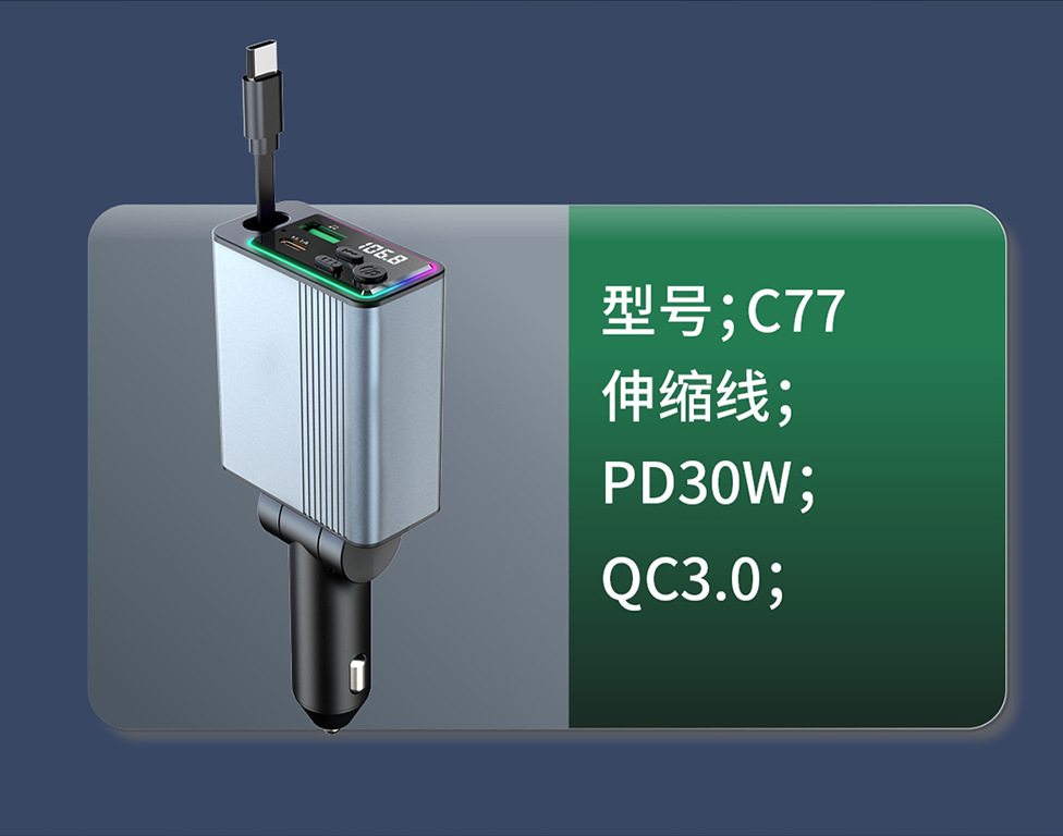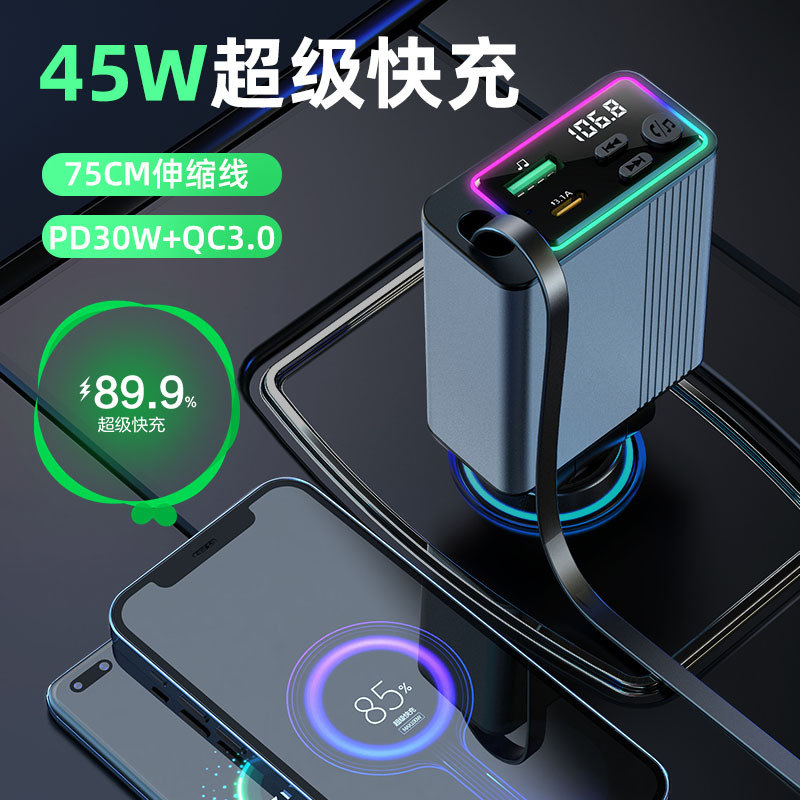 45W car charger car 3-in-1 with retractable cord, mobile phone interface cigarette lighter, Kaiweidi fast charging