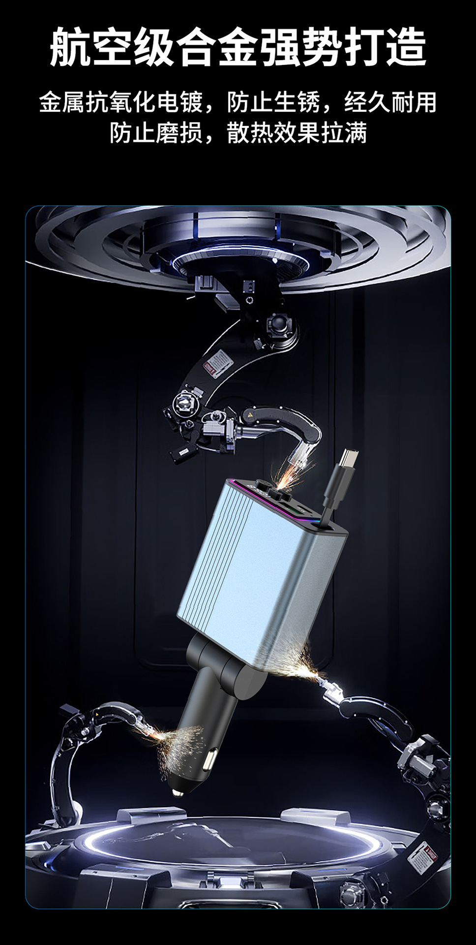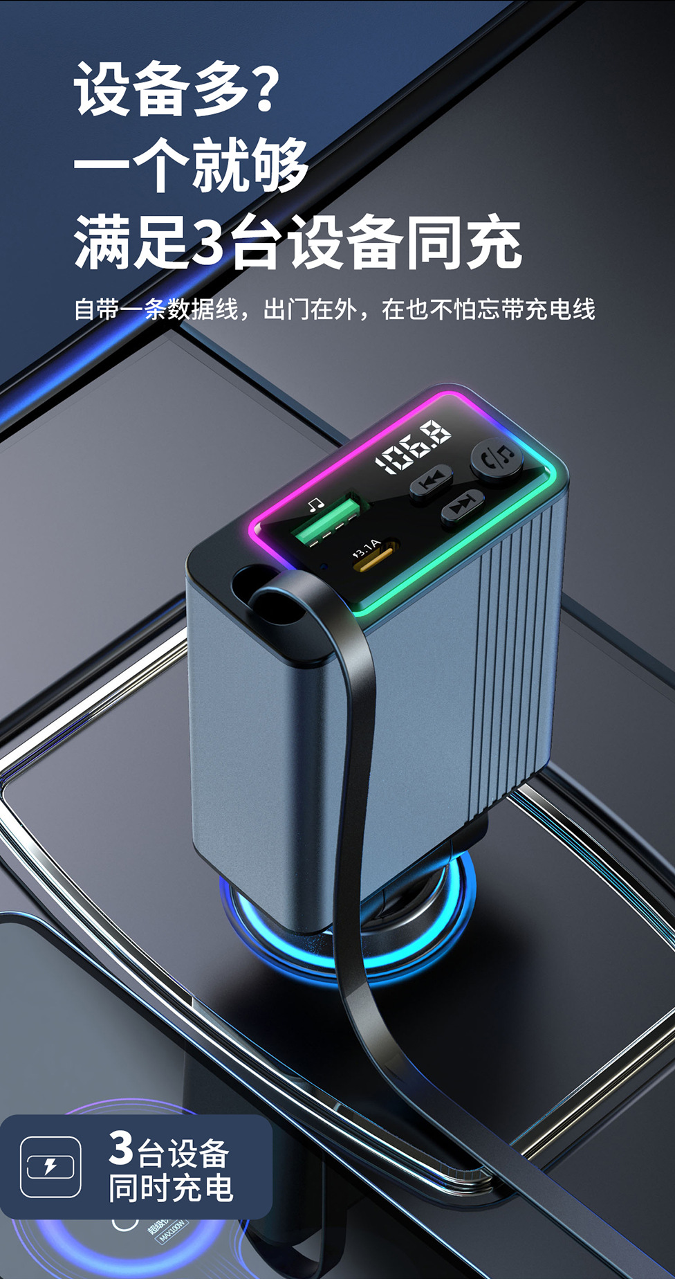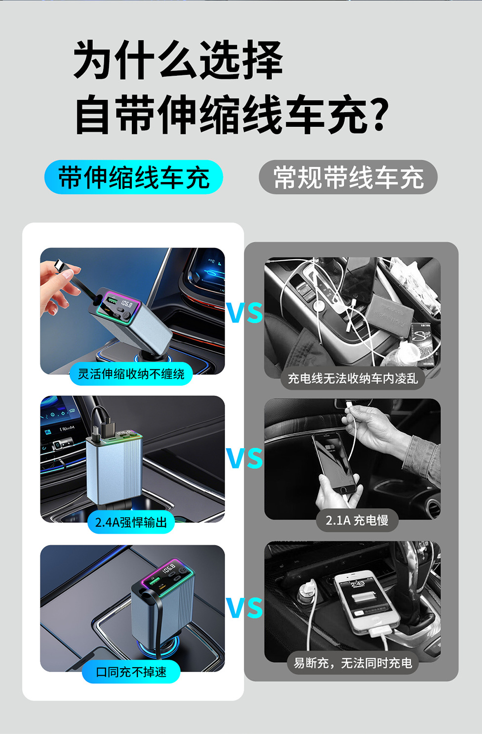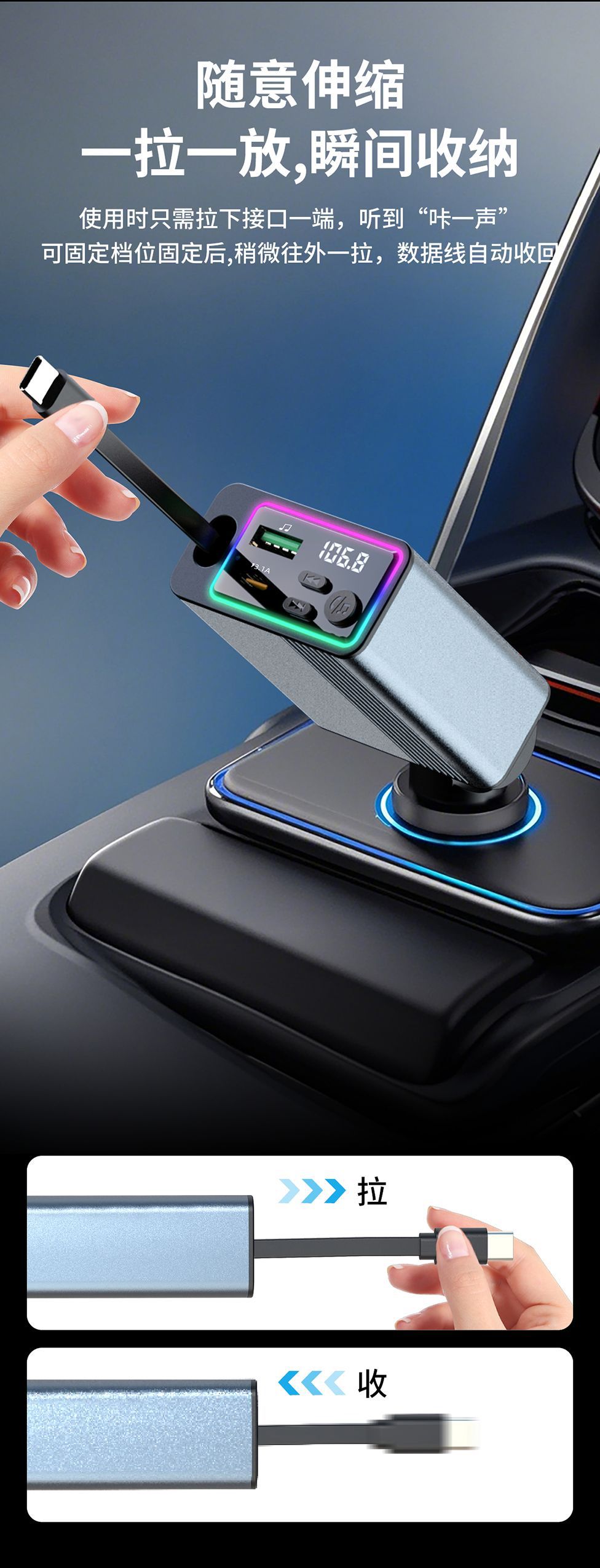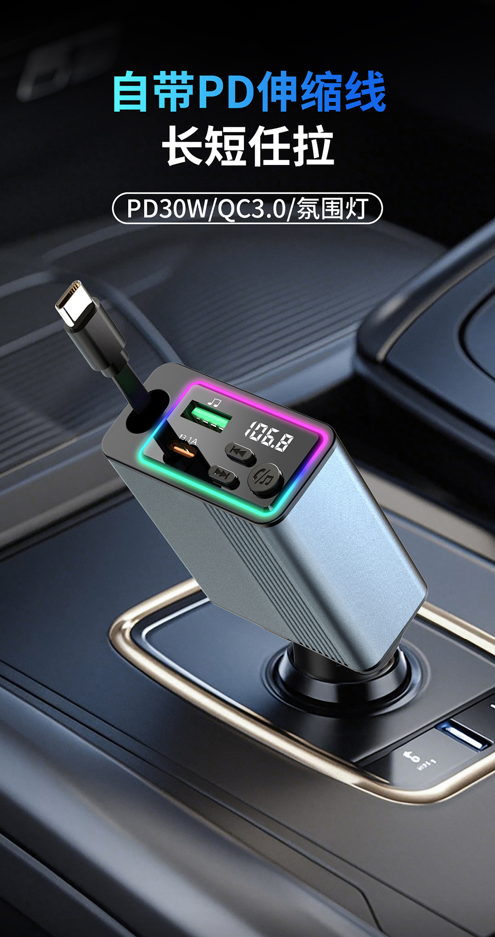 45W car charger car 3-in-1 with retractable cord, mobile phone interface cigarette lighter, Kaiweidi fast charging