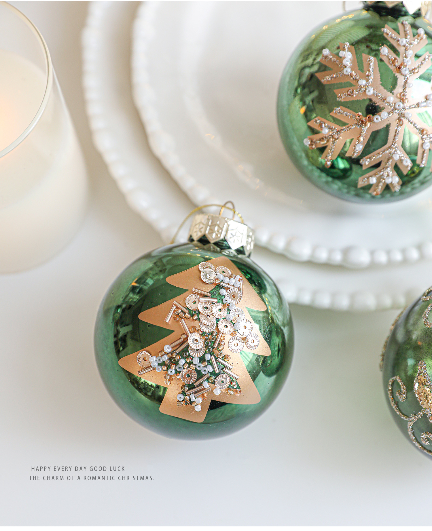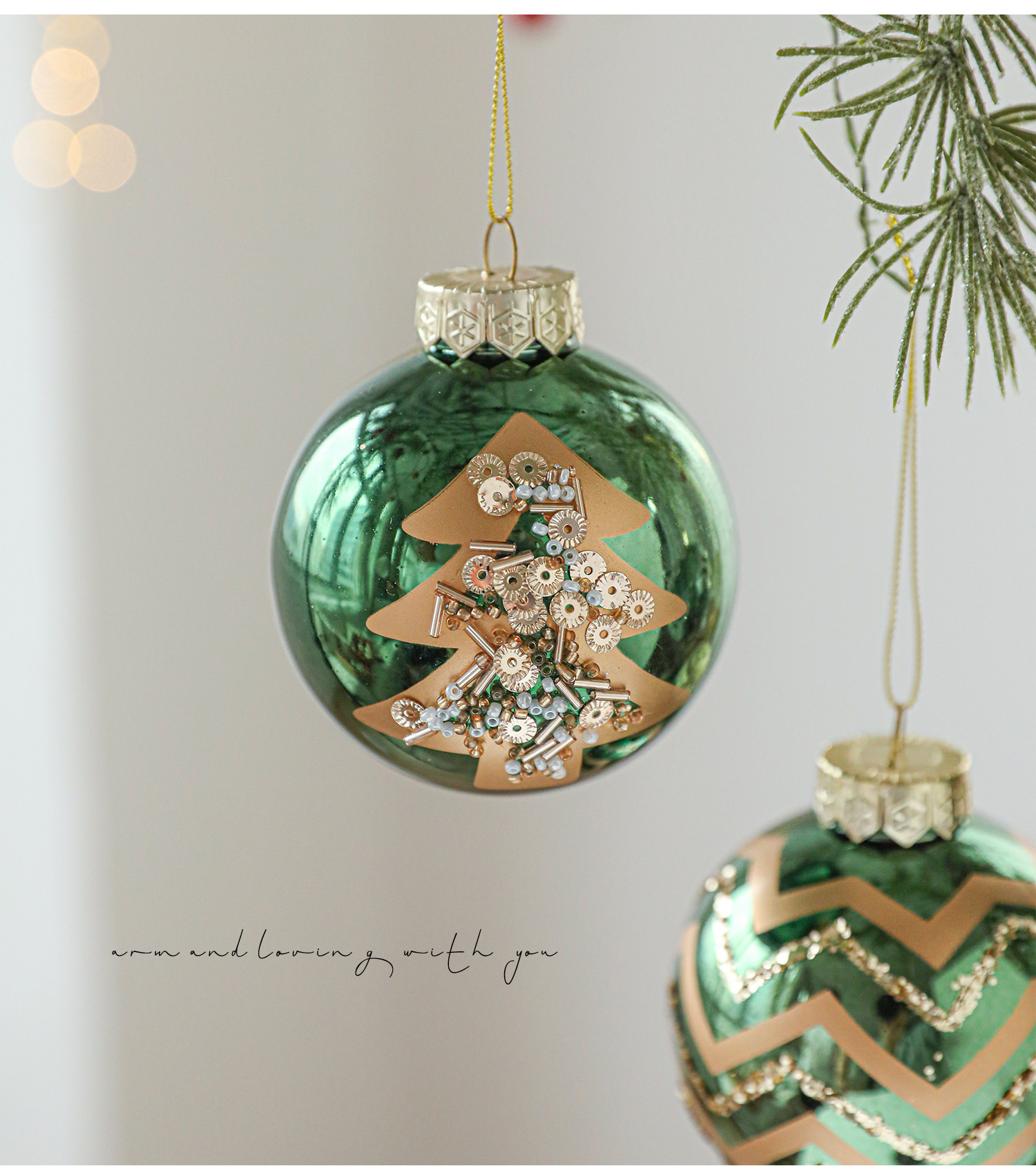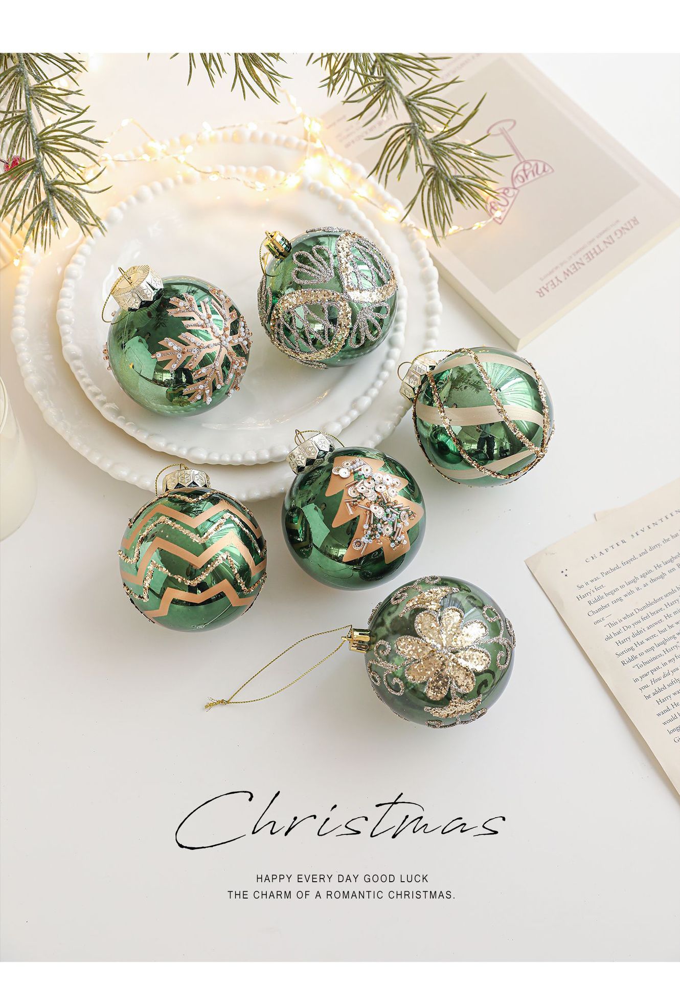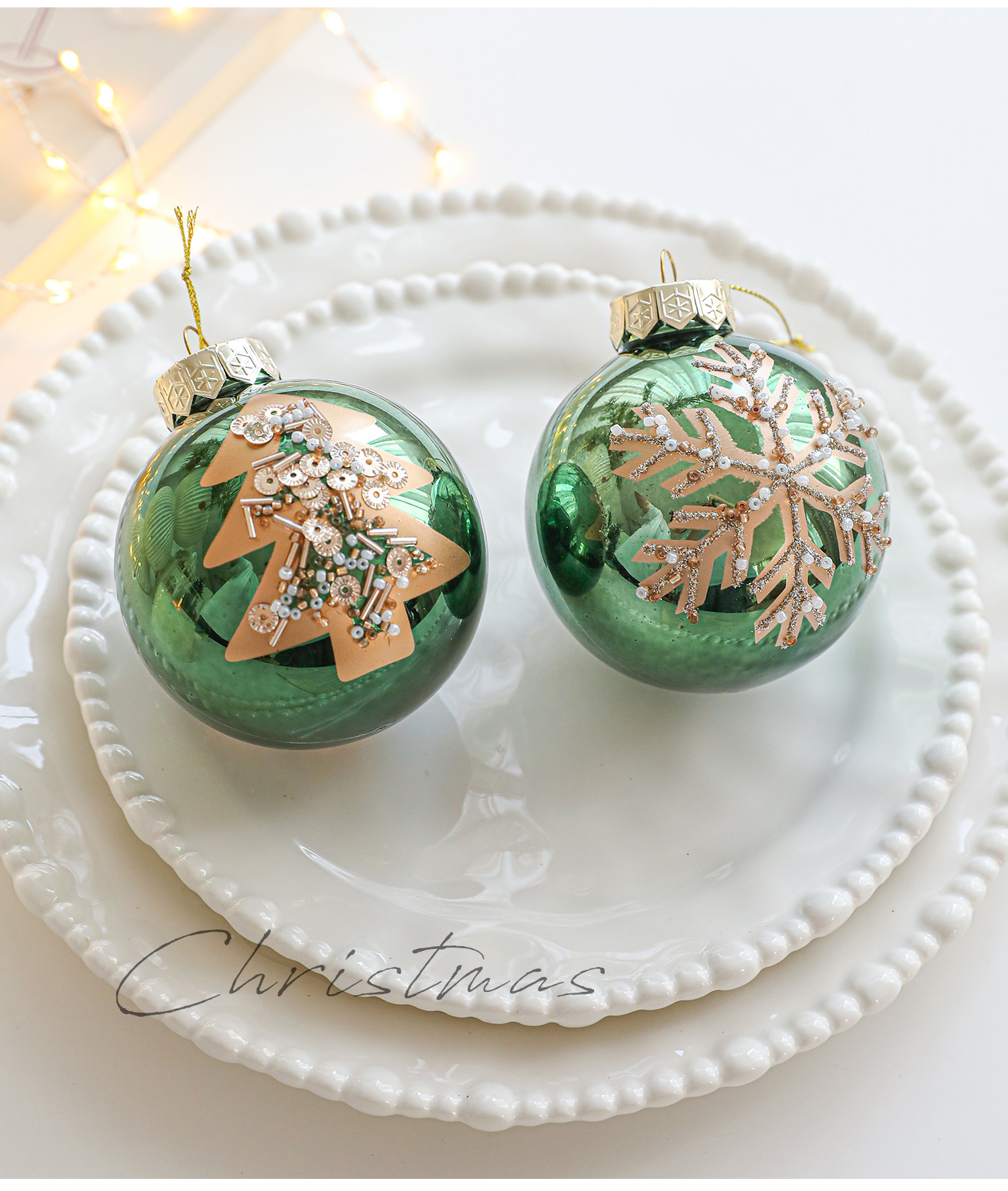 Green glossy Christmas ball sticky powder gold powder high-grade electroplating ball pearlescent hand-painted pattern Christmas tree decoration arrangement