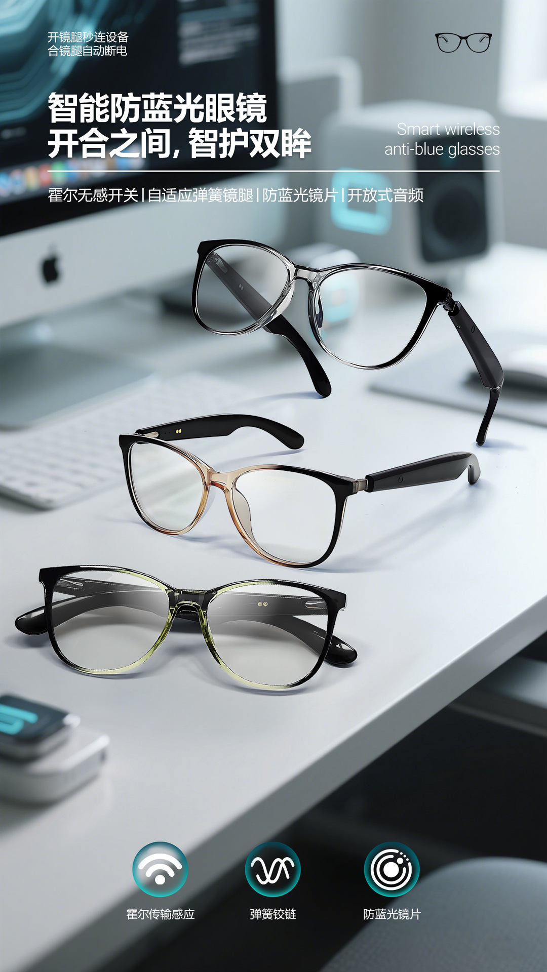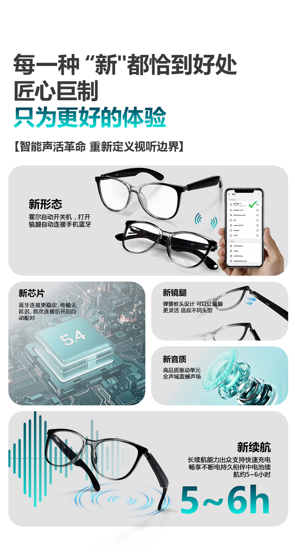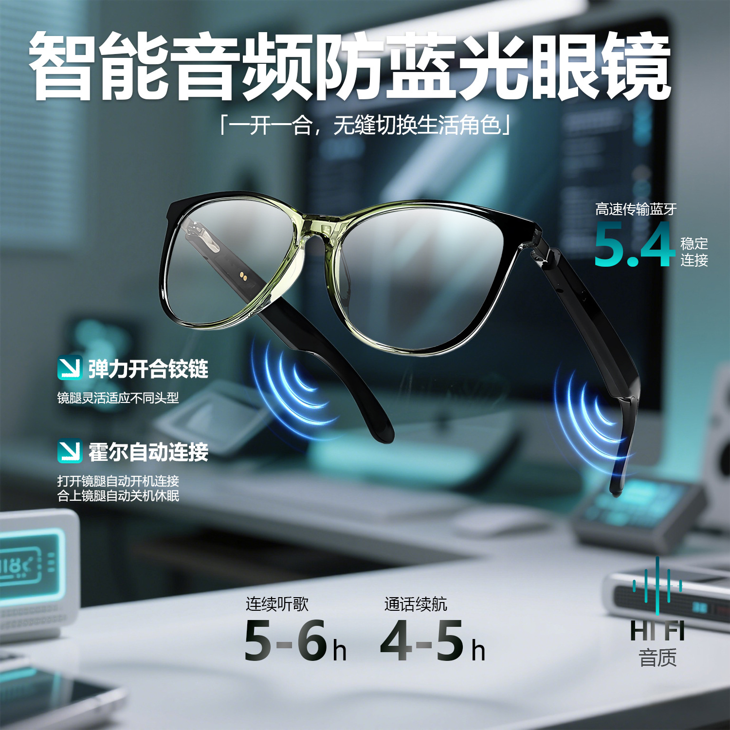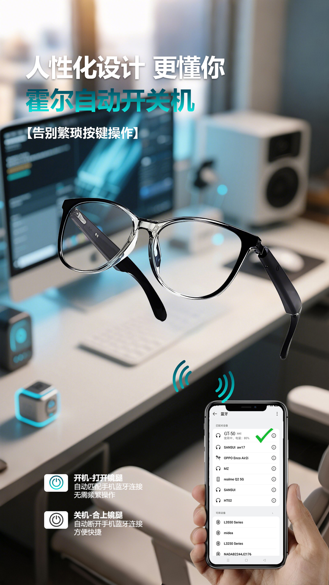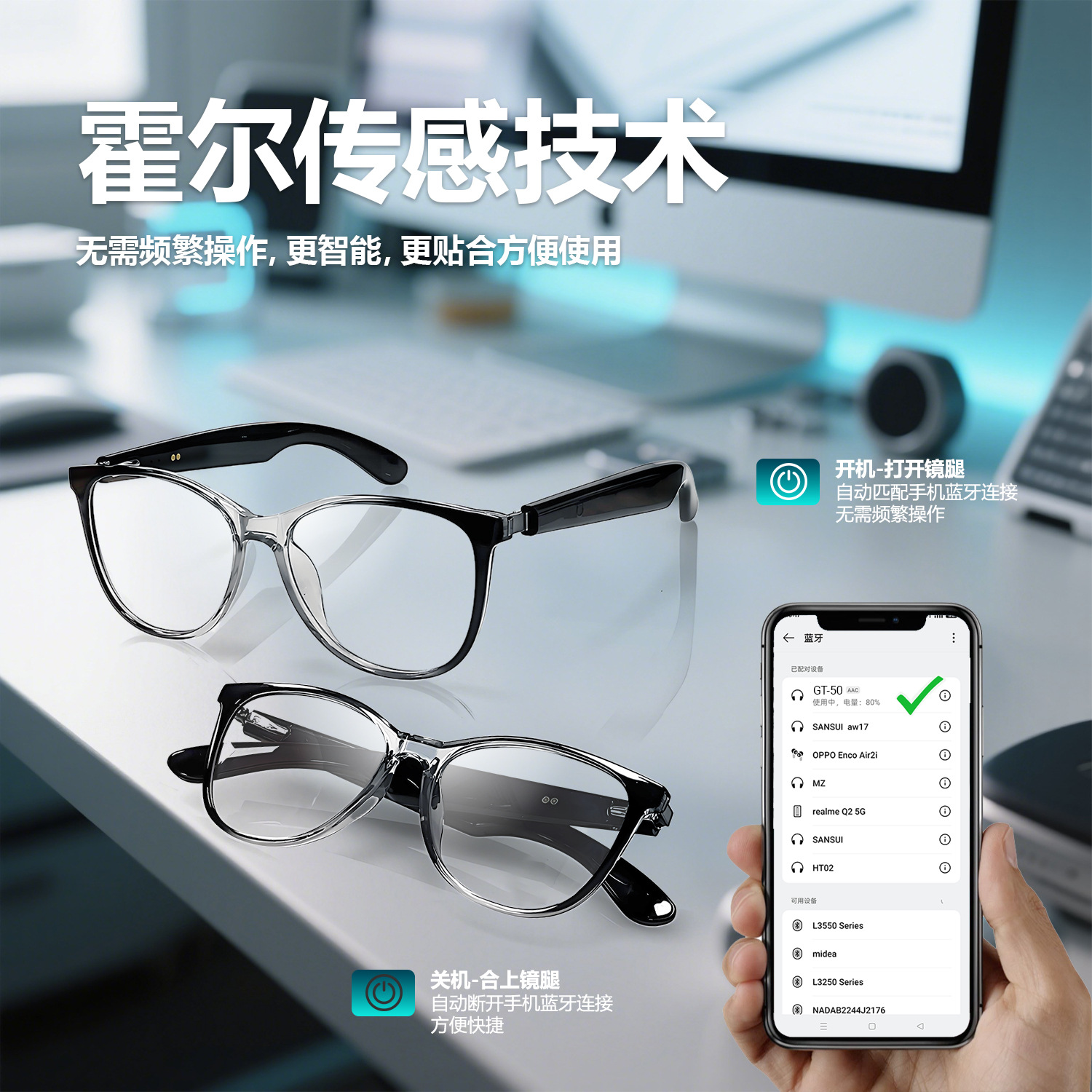 GT50 automatic on/off Bluetooth glasses metal spring hinge design AI smart glasses listening to songs and call glasses