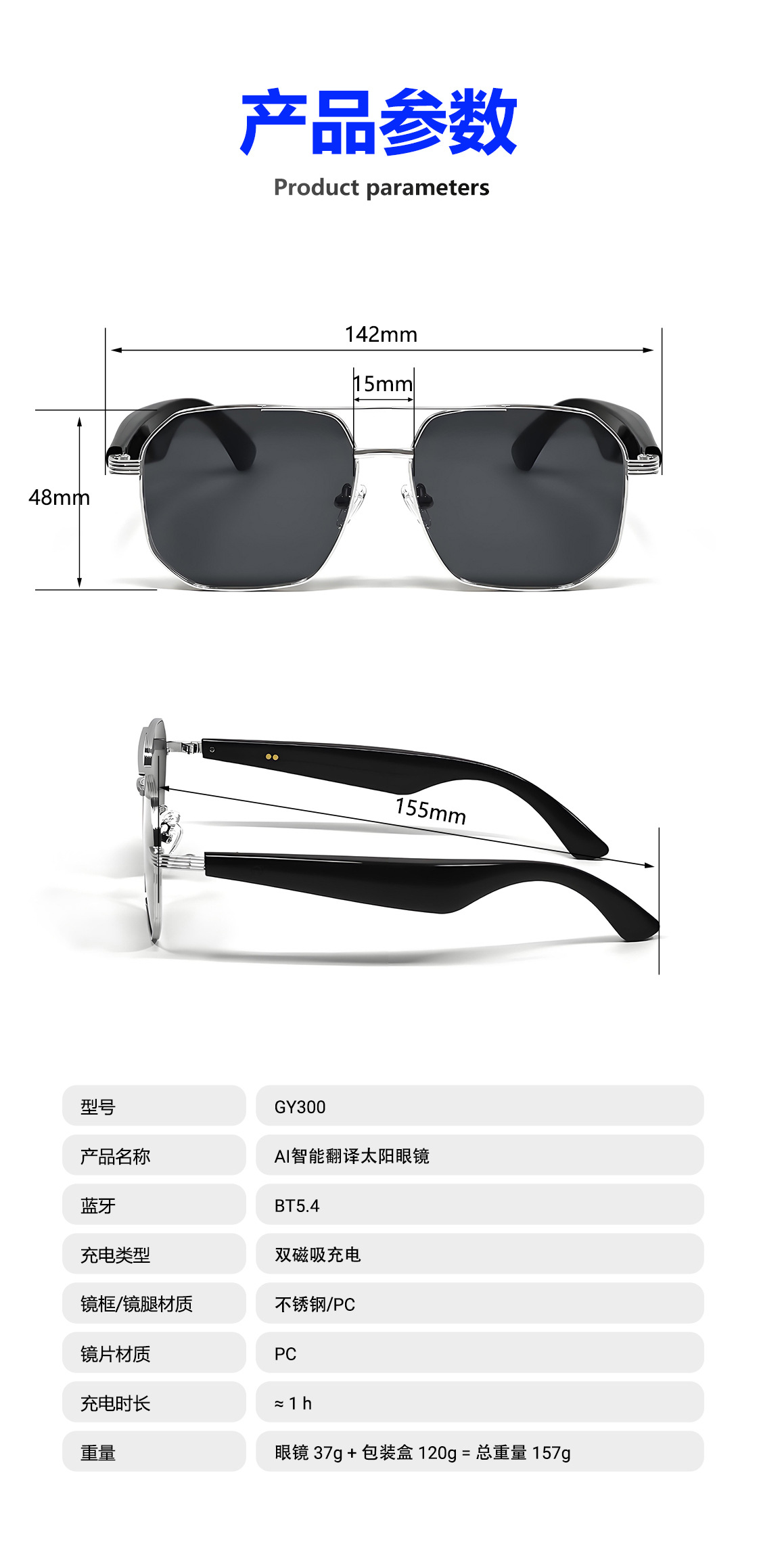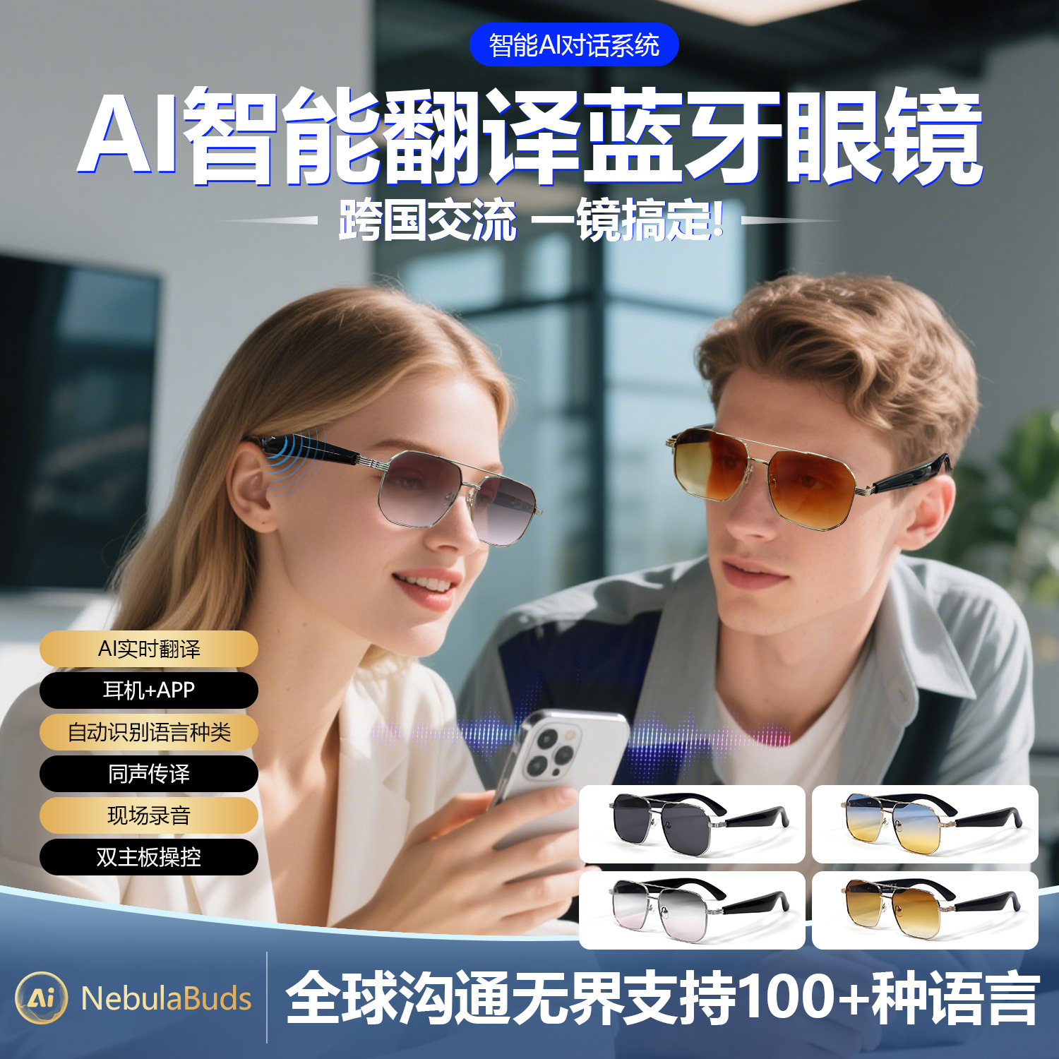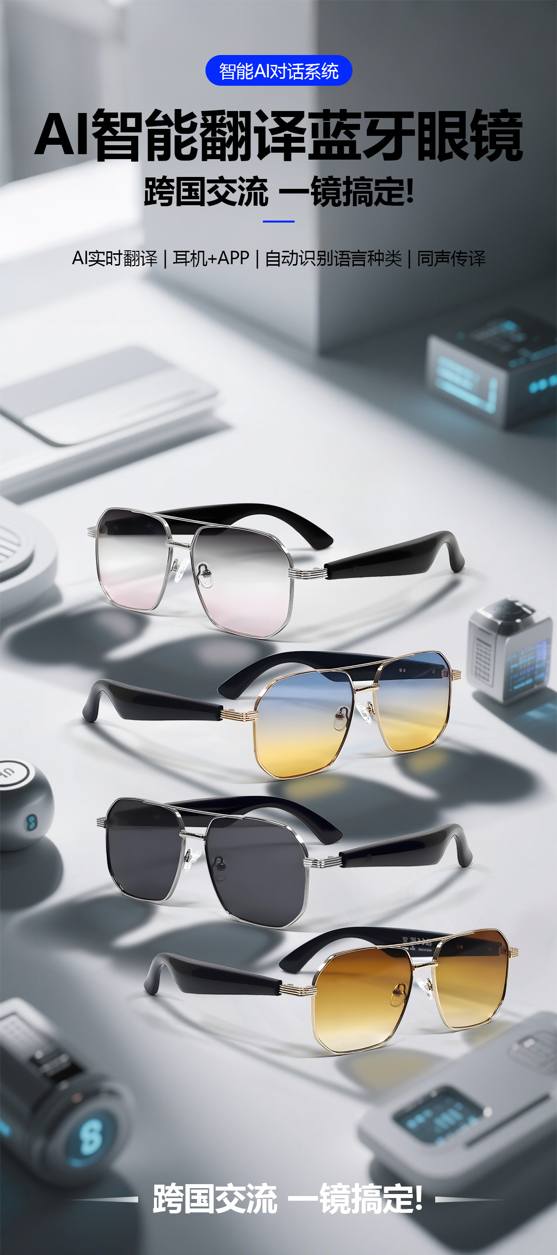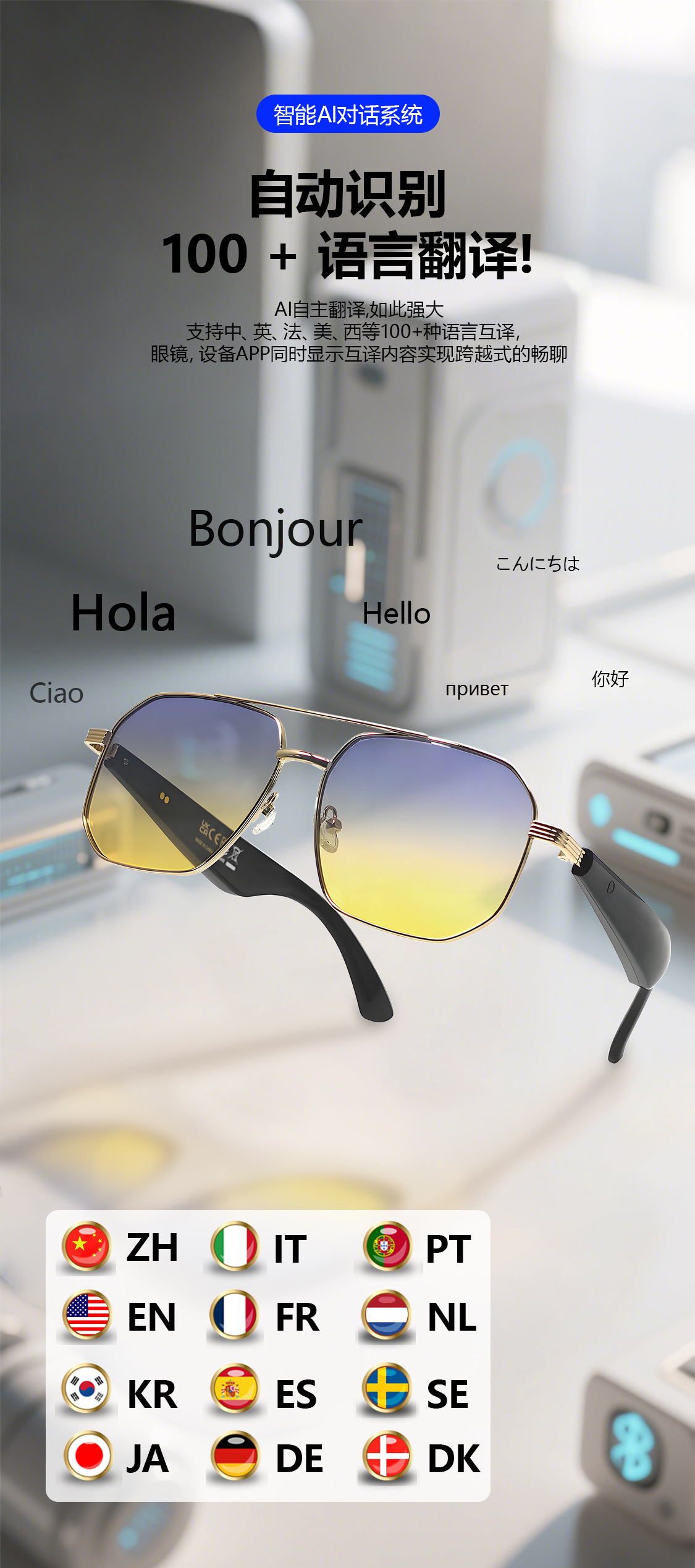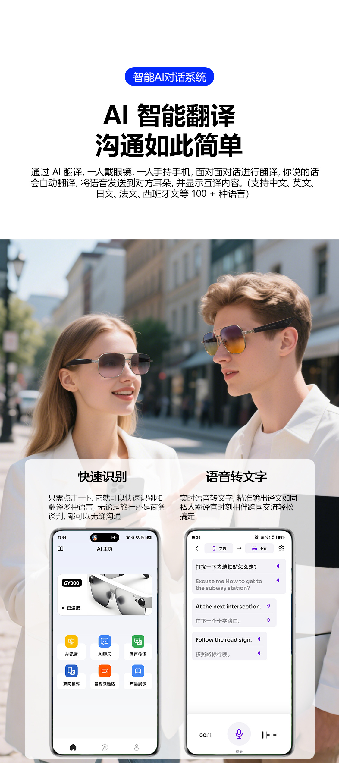 GY300 AI Translation Bluetooth Glasses More than 100 Languages Real-time Translation Glasses Listening to Songs and Calling Smart Glasses