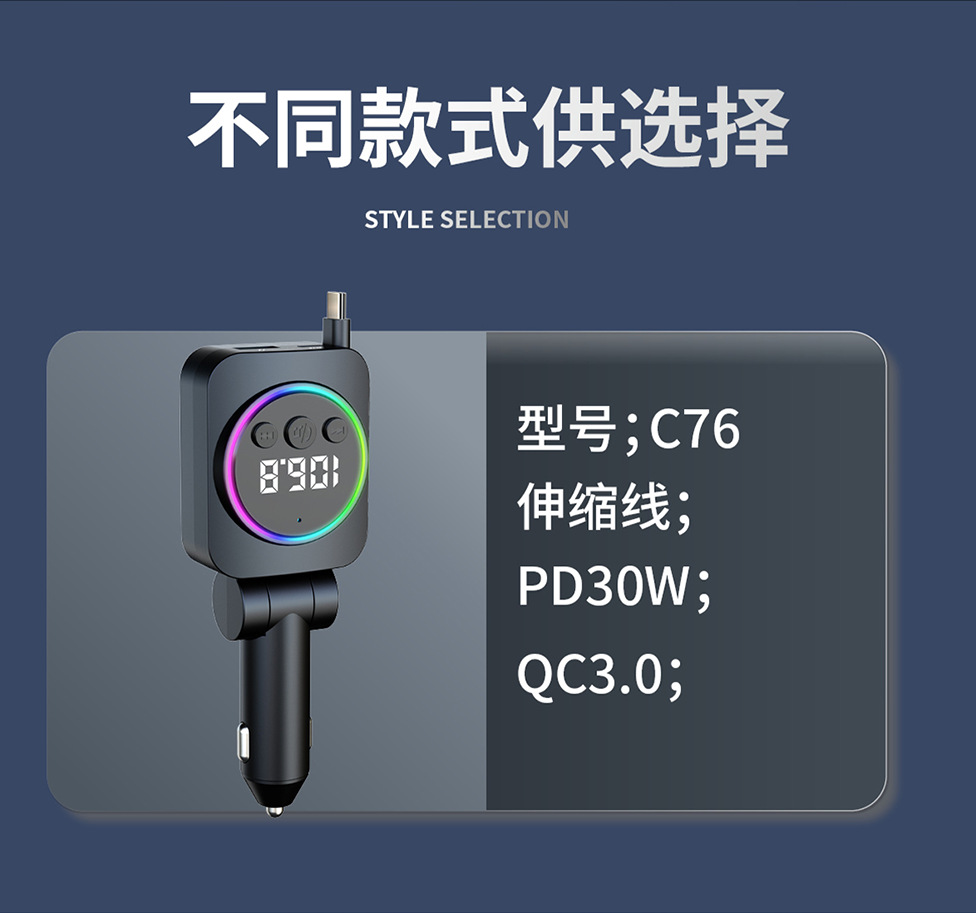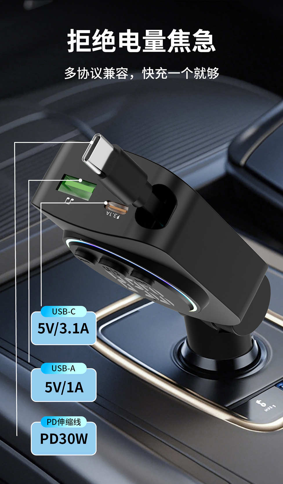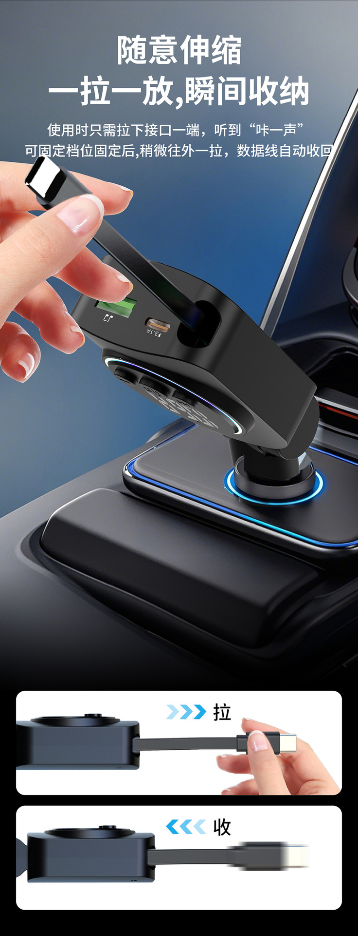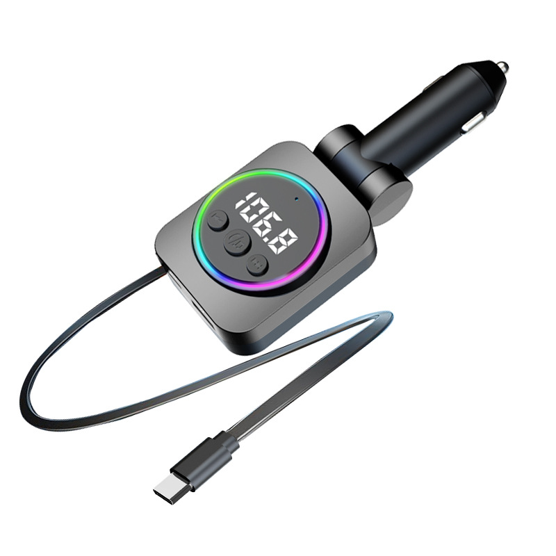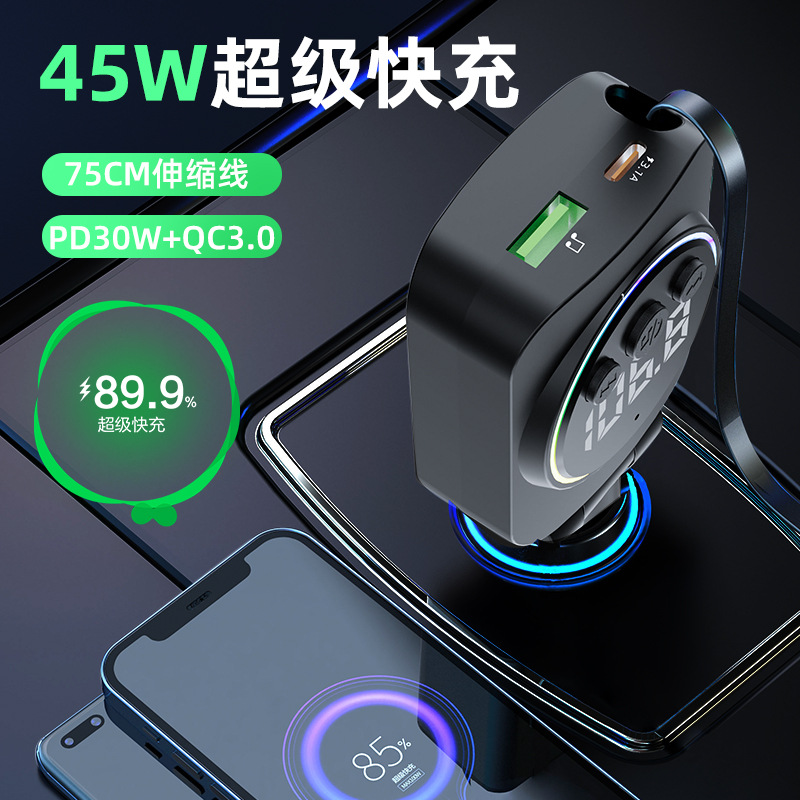 Telescopic Cord Car Charger Fast Charging 45W Digital Display Multi-function 3-in-1 Car Cigarette Lighter Car Charger Durable