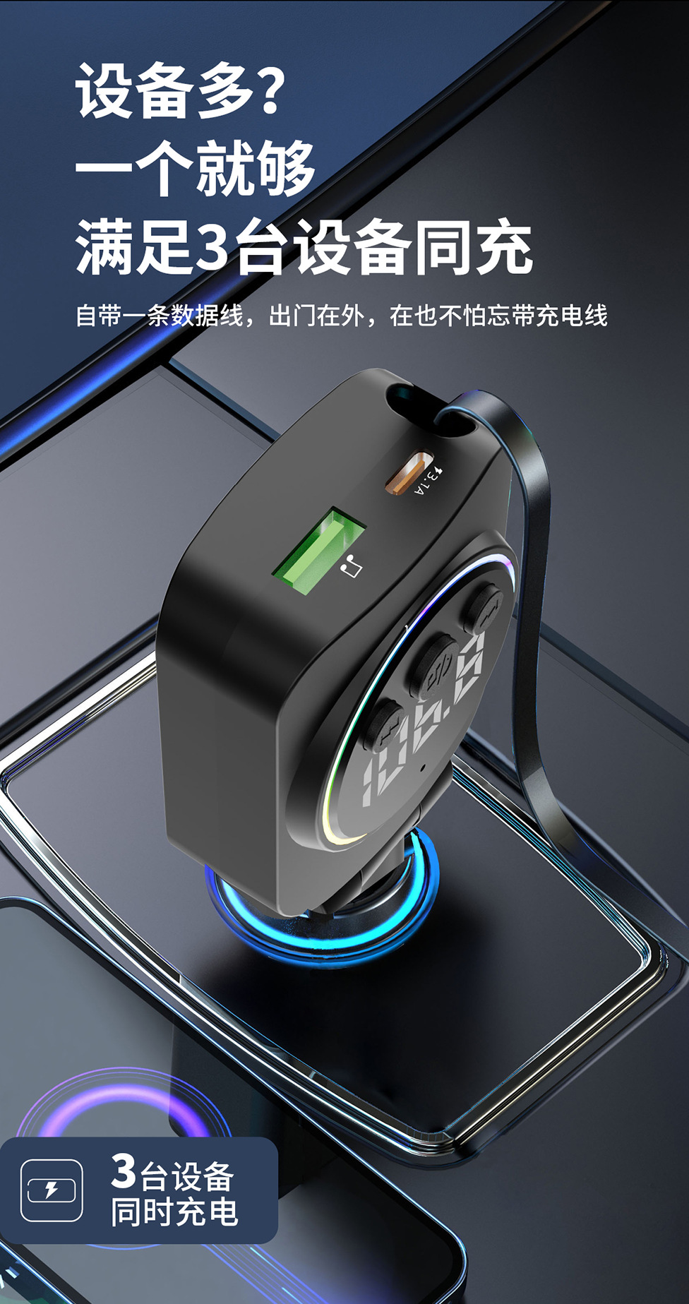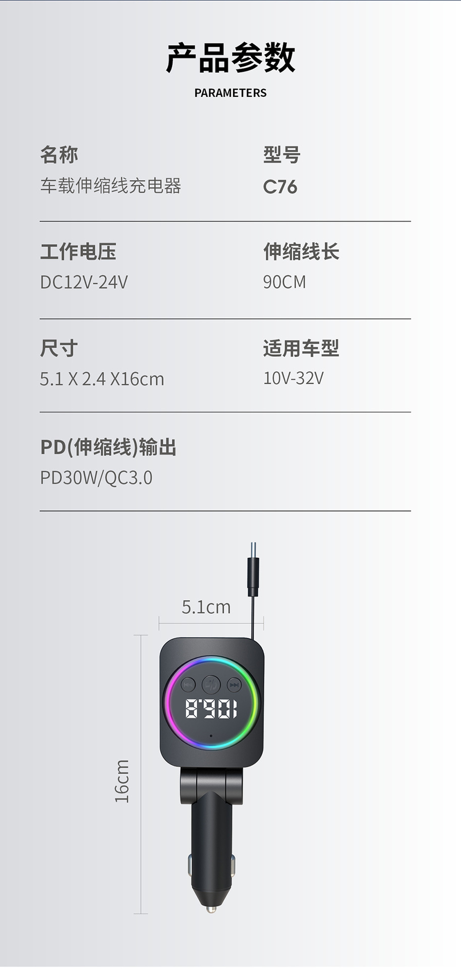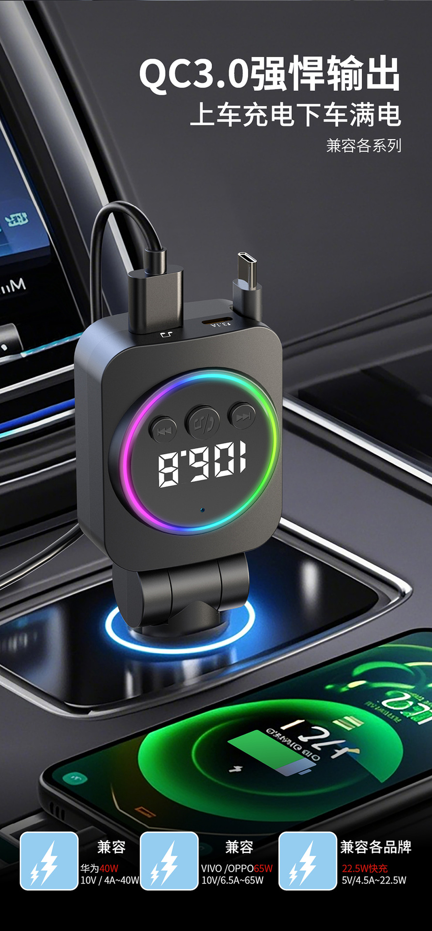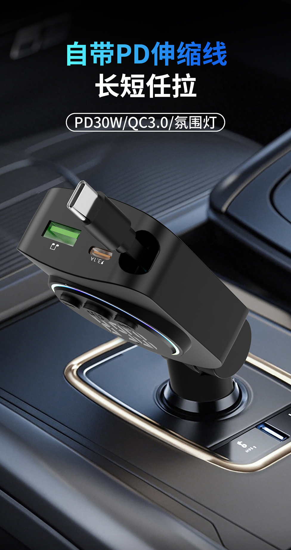 Telescopic Cord Car Charger Fast Charging 45W Digital Display Multi-function 3-in-1 Car Cigarette Lighter Car Charger Durable