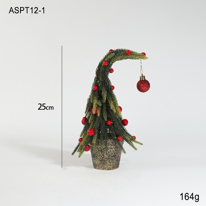 New Green Crooked Neck Christmas Tree Simulation with Snow Mini Red Fruit Potted Plant Small Tabletop Ornament Ornament