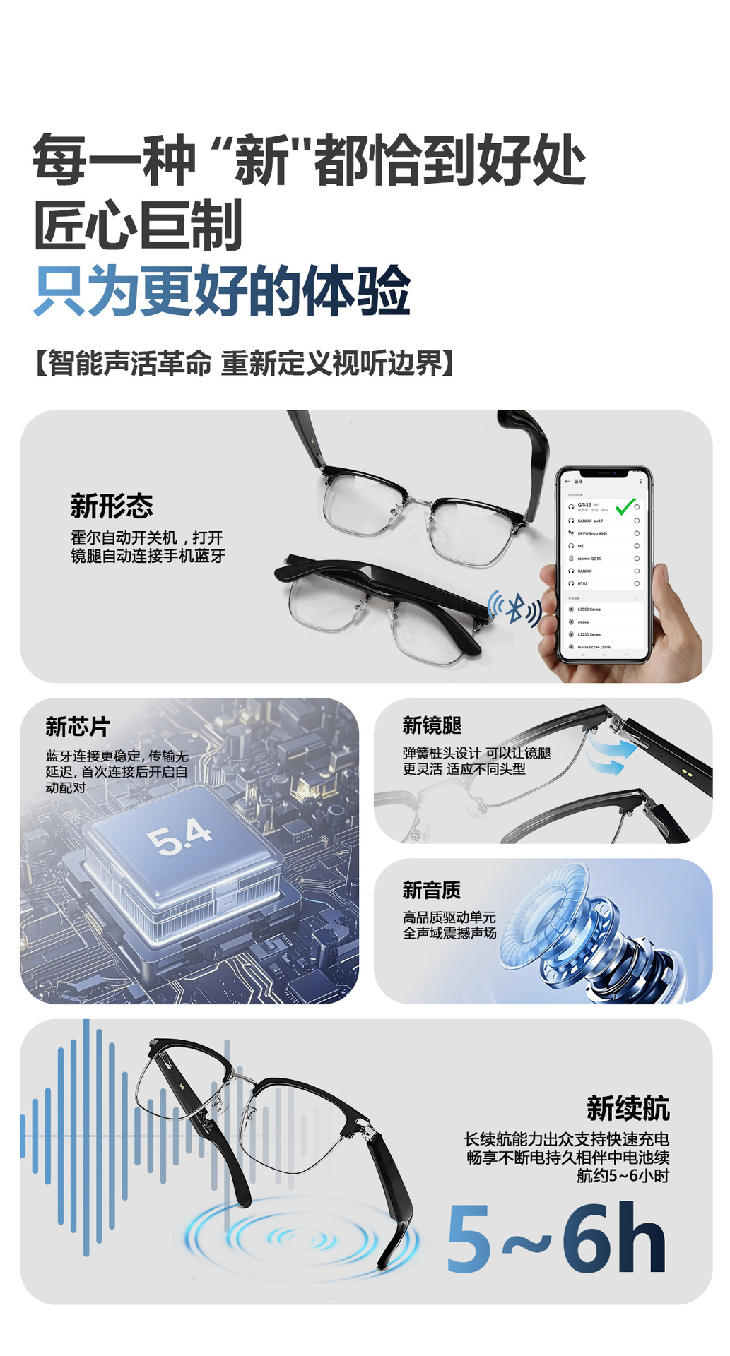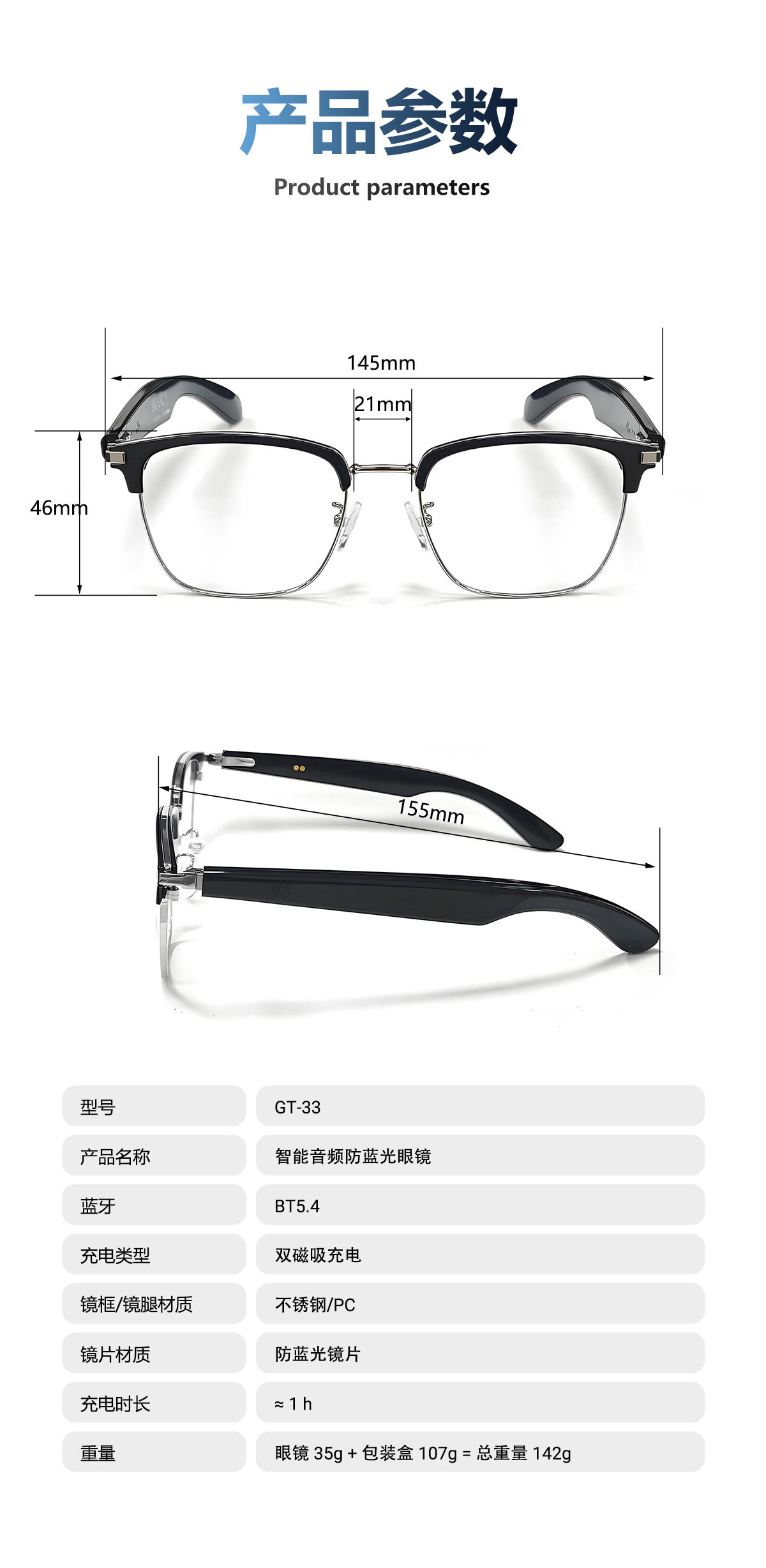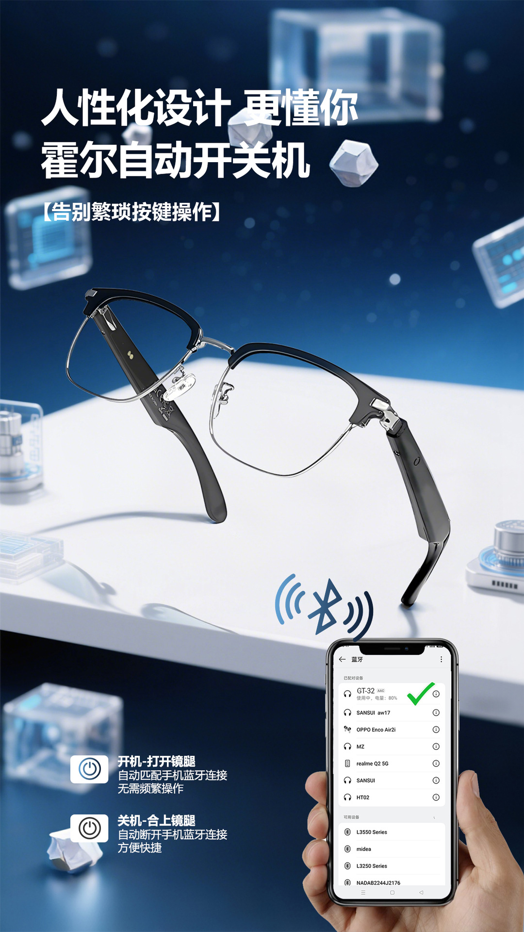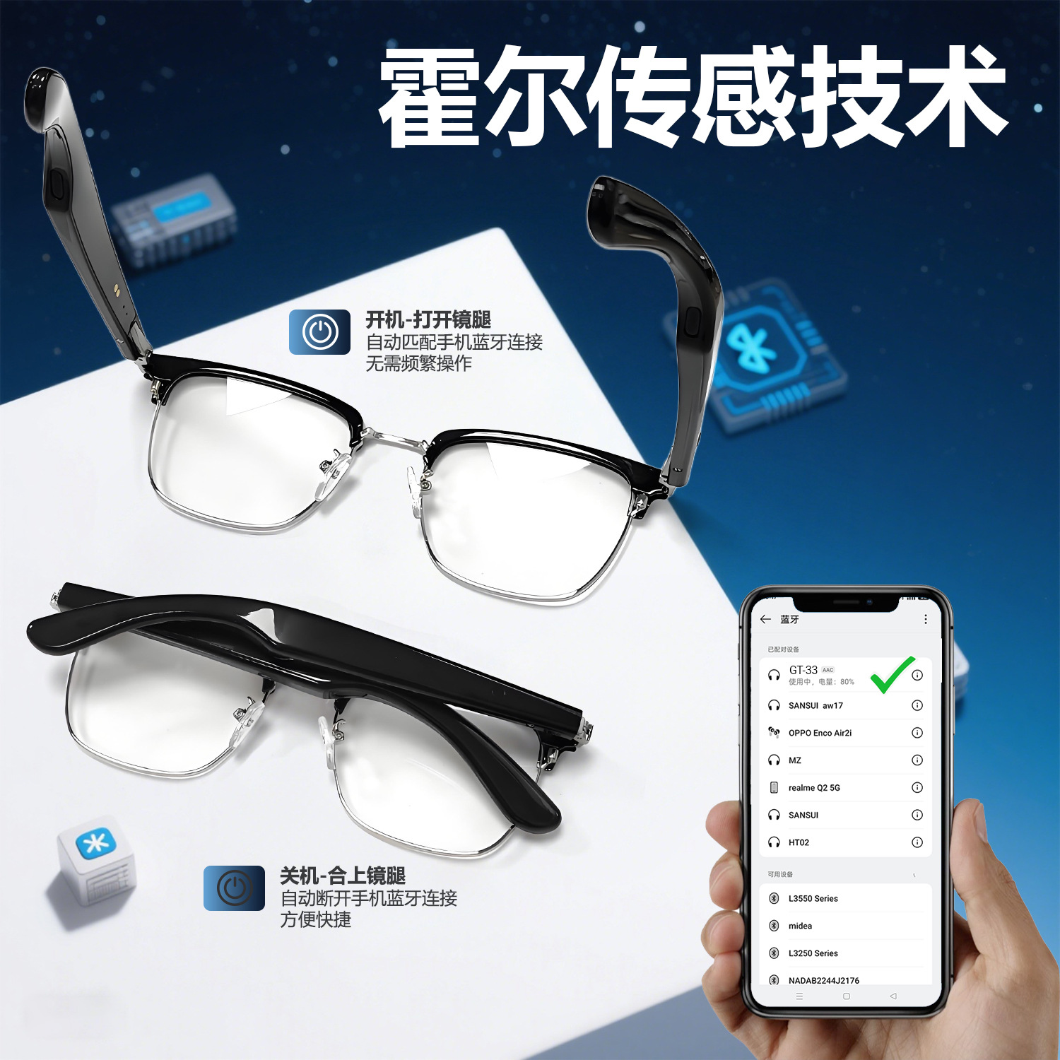 GT33 automatic on/off Bluetooth glasses metal spring hinge design AI smart glasses listening to songs and call glasses