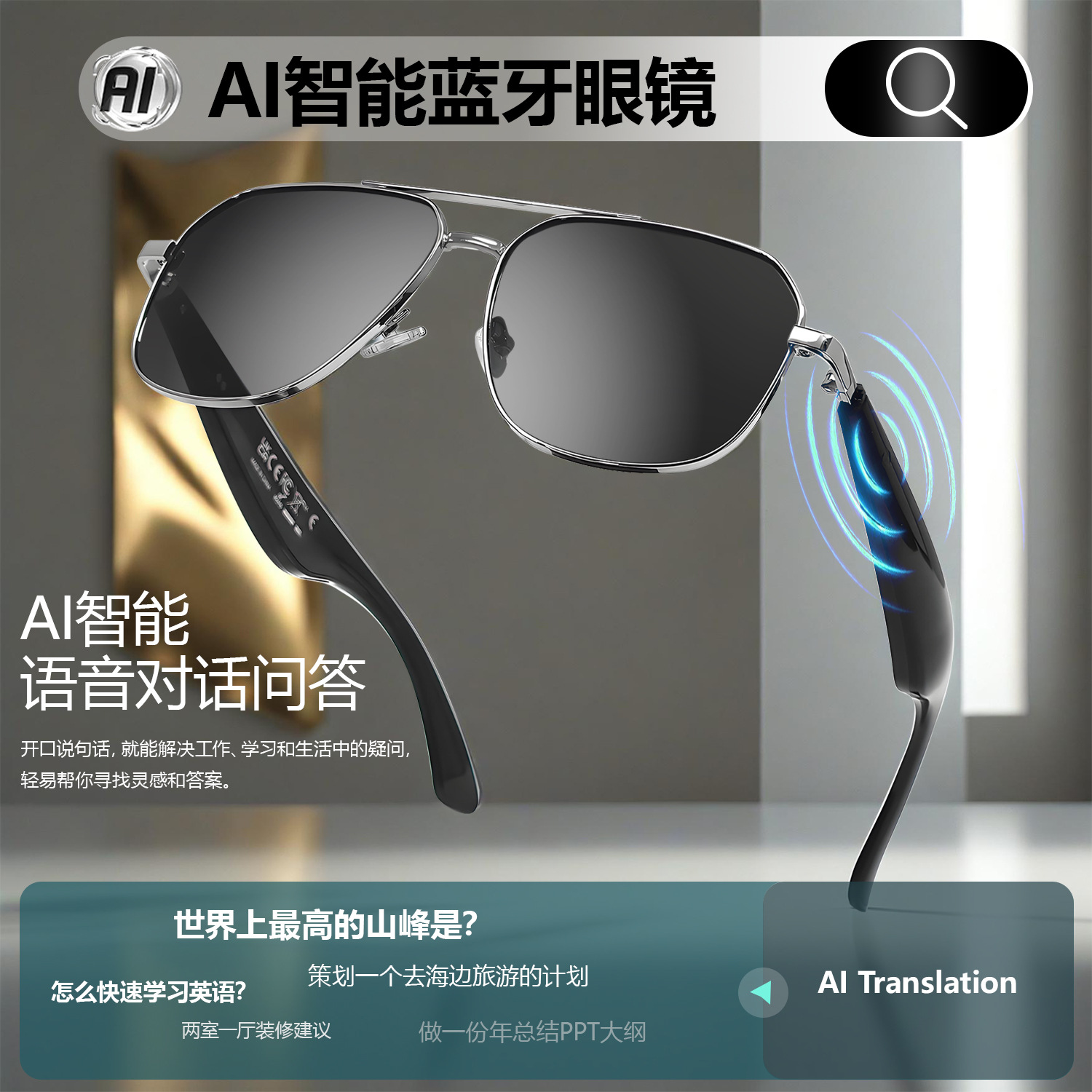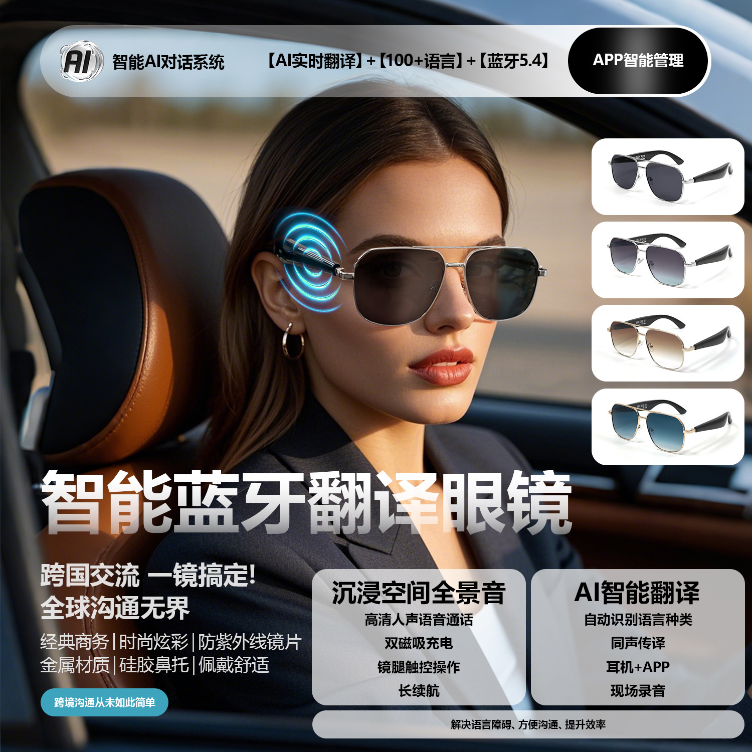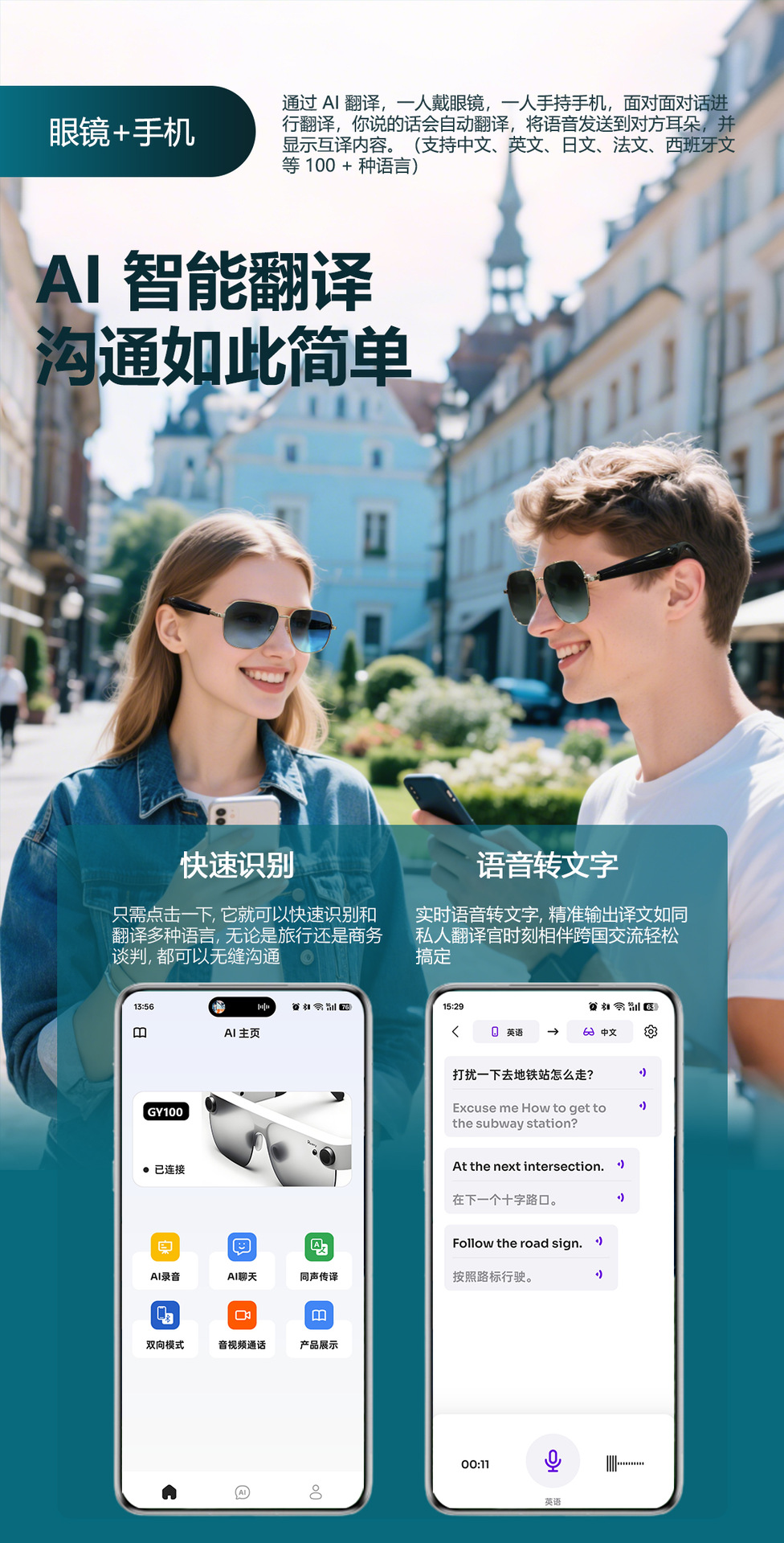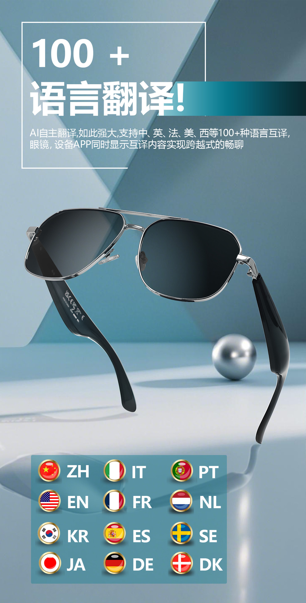 GY100 AI Translator Bluetooth Glasses More than 100 Languages Real-time Translation Glasses Listening to Songs and Calling Smart Glasses