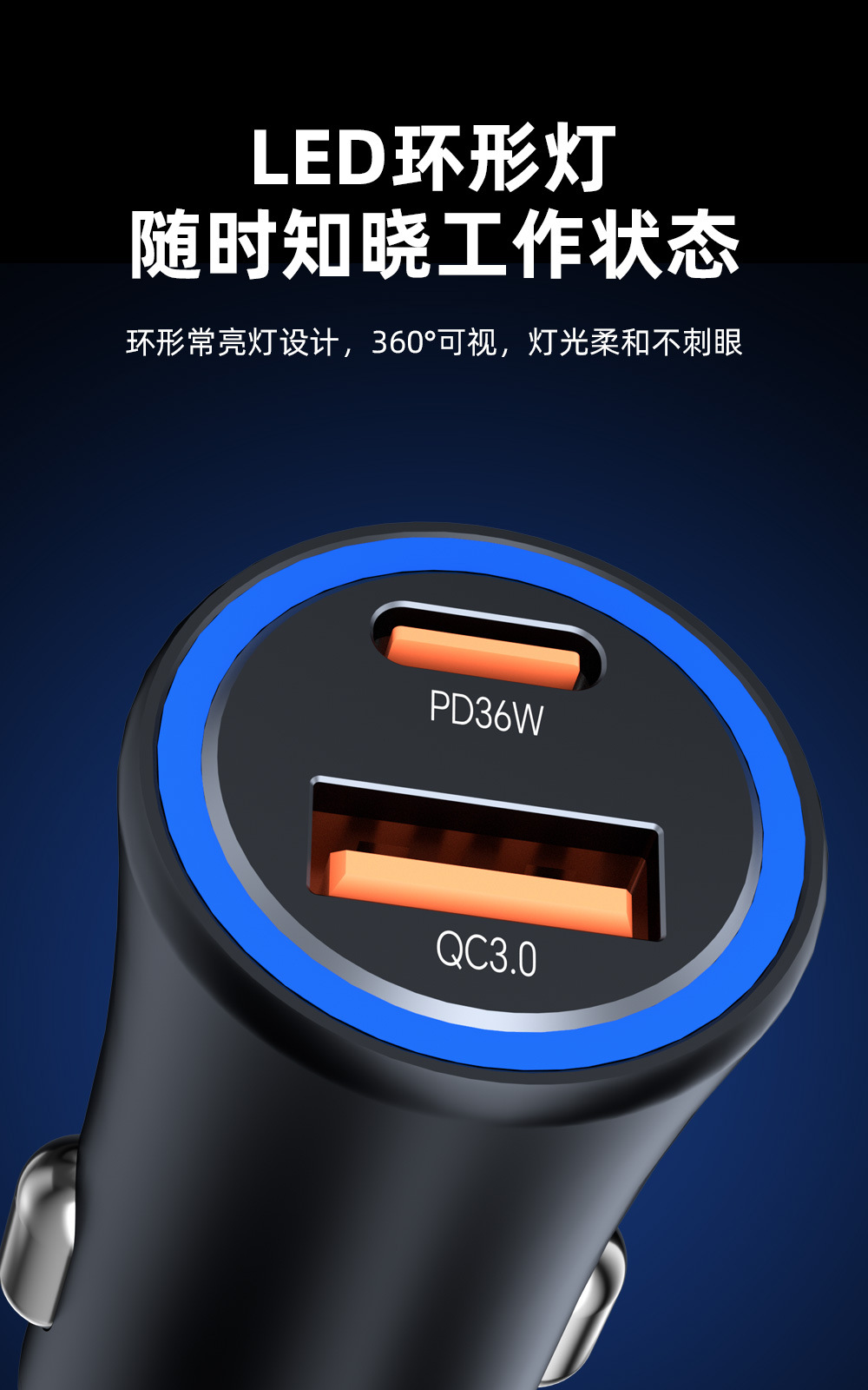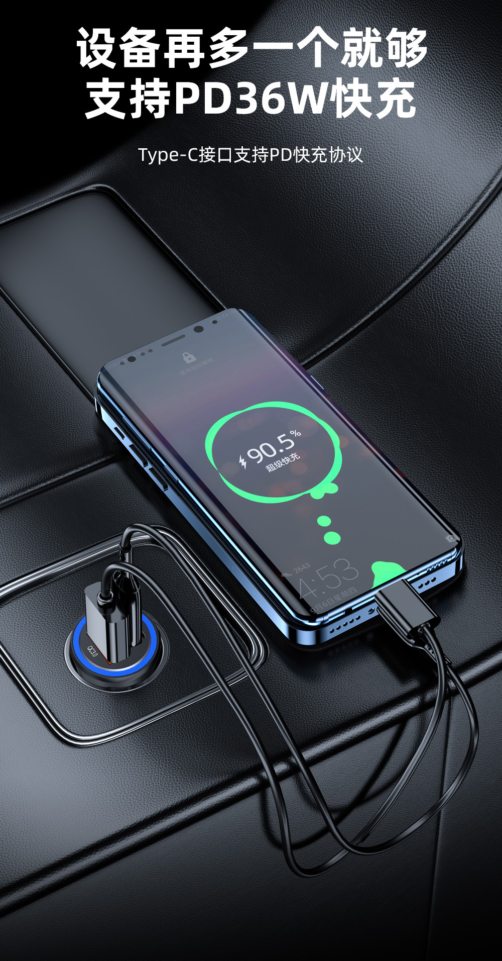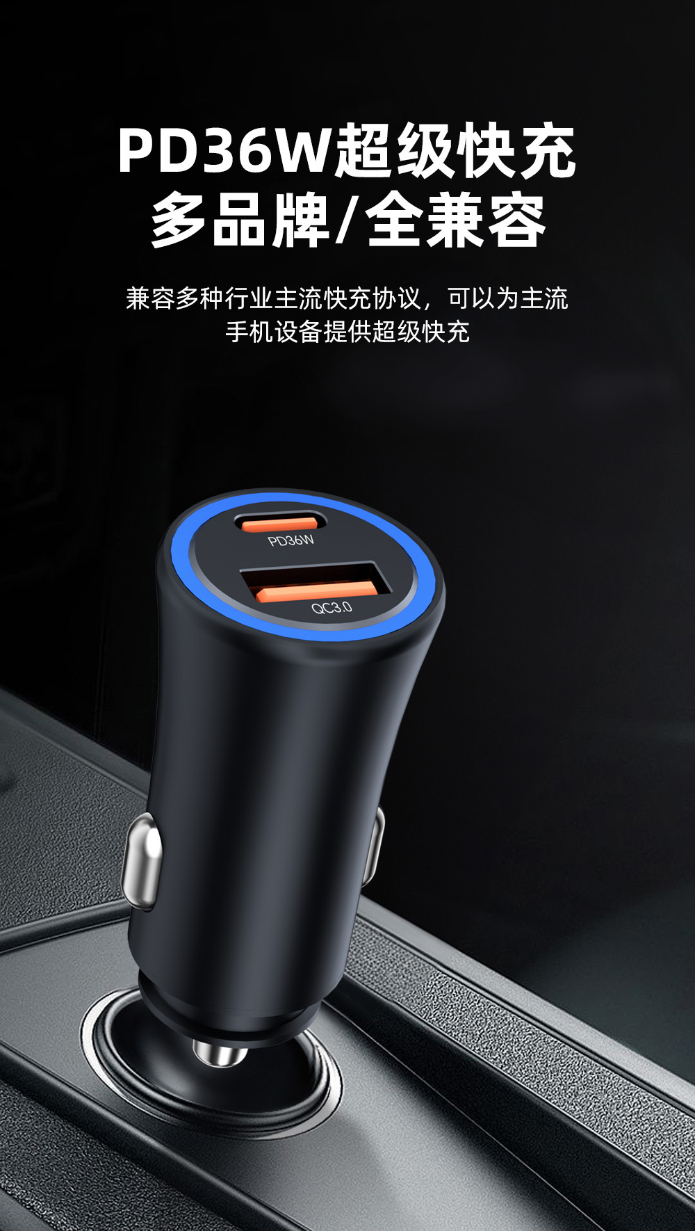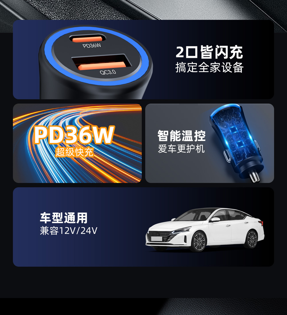 Cross-border new product one A and one C dual-port fast charging PD36W super fast charging car cigarette lighter USB-A15W fast charging