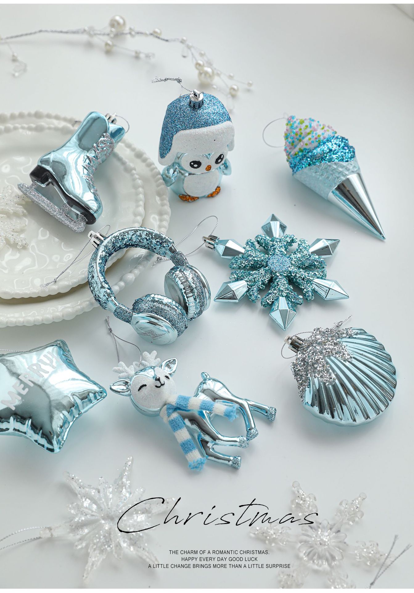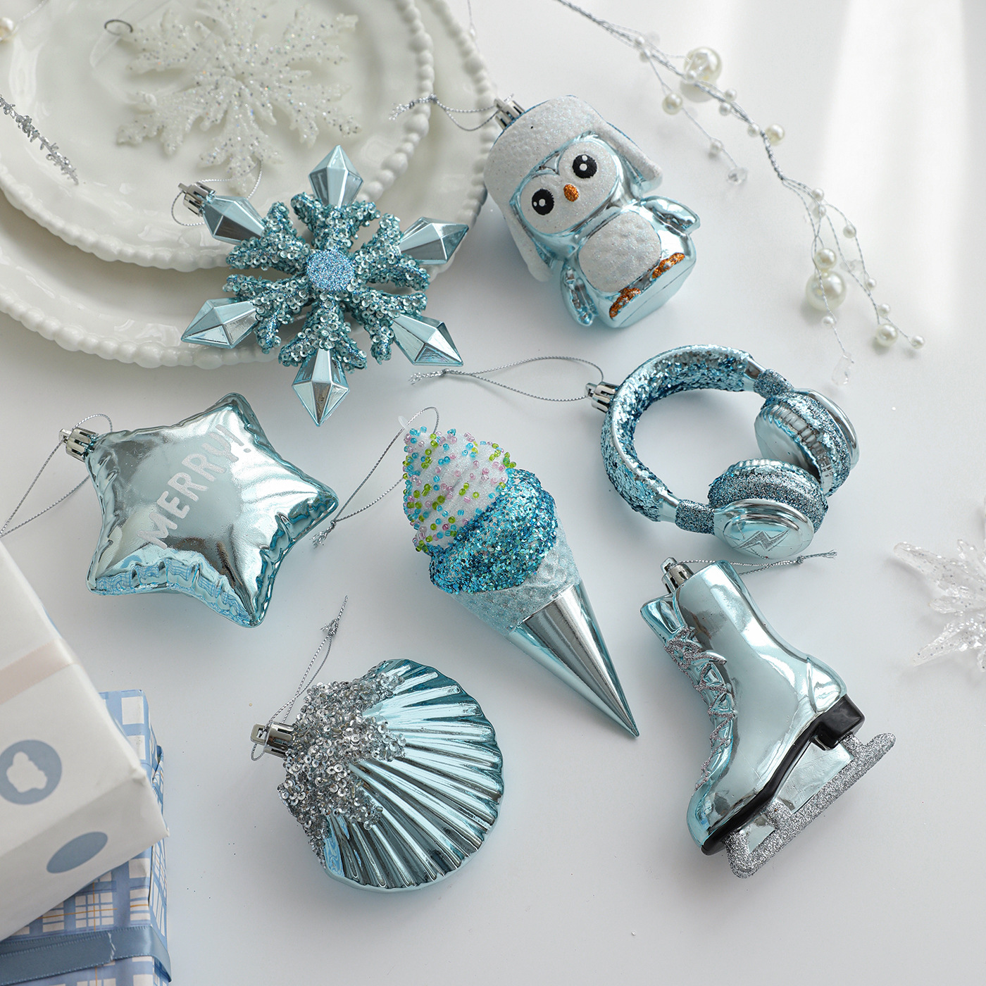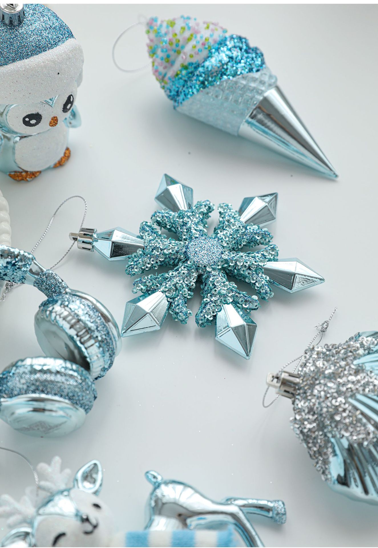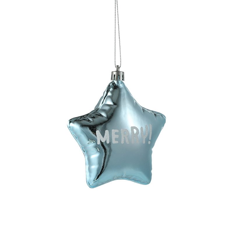 Cross-border blue plastic pendant sticky powder Christmas tree window ornament five-pointed star snowflake cartoon decoration scene layout