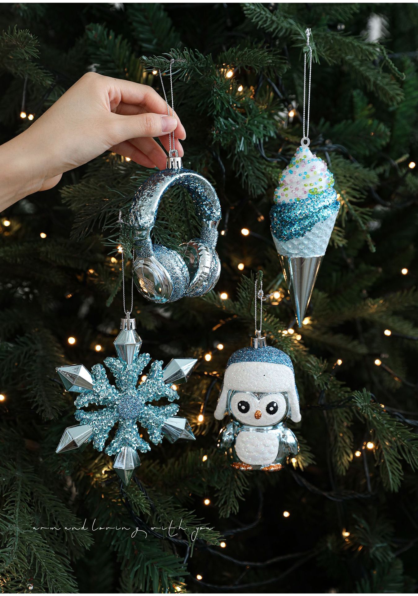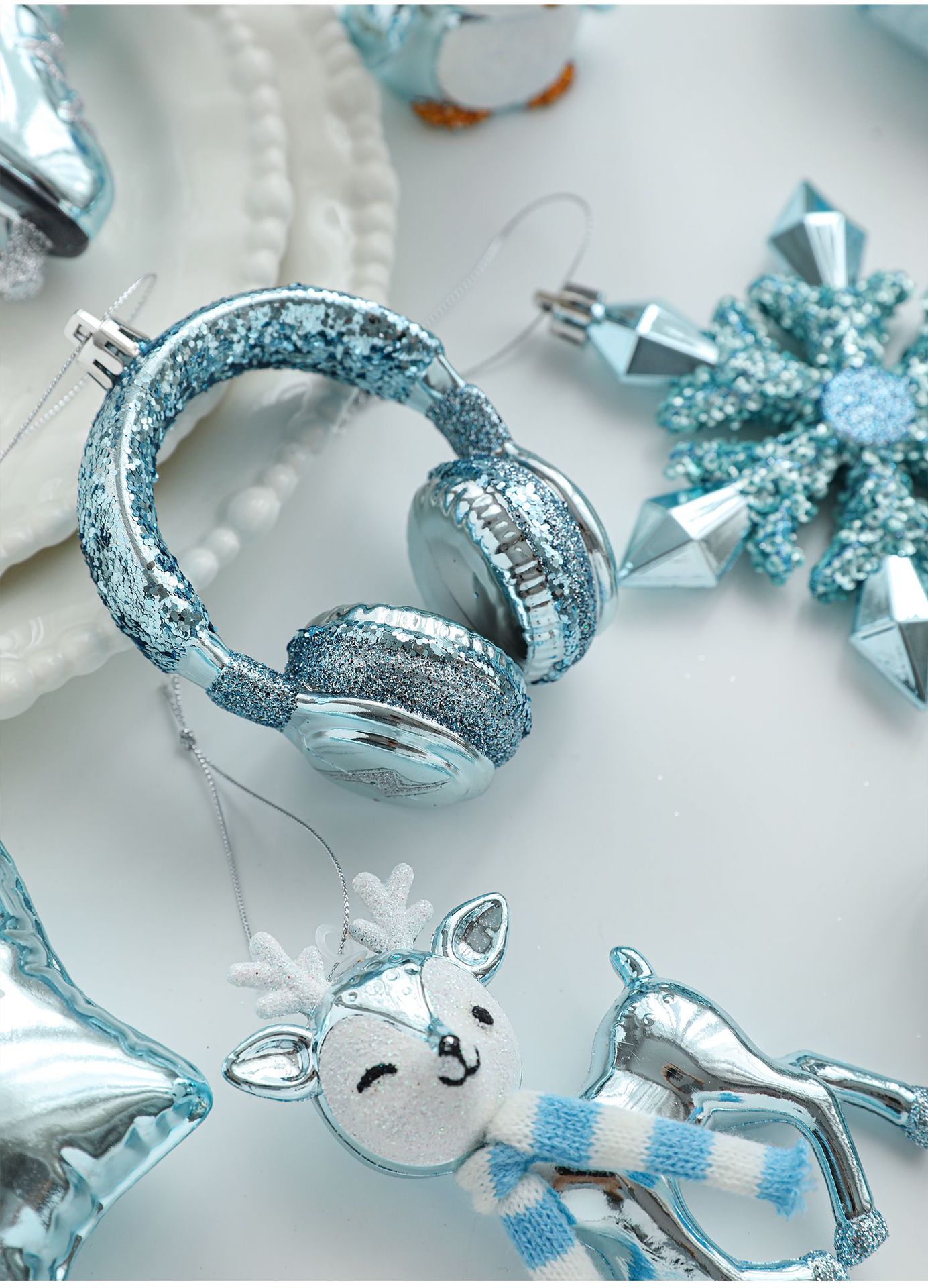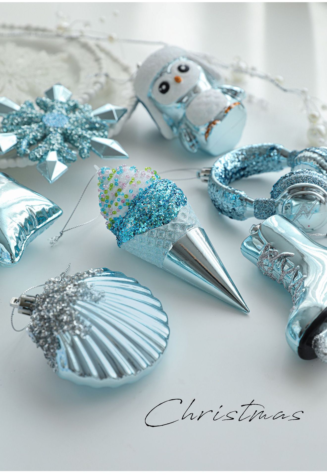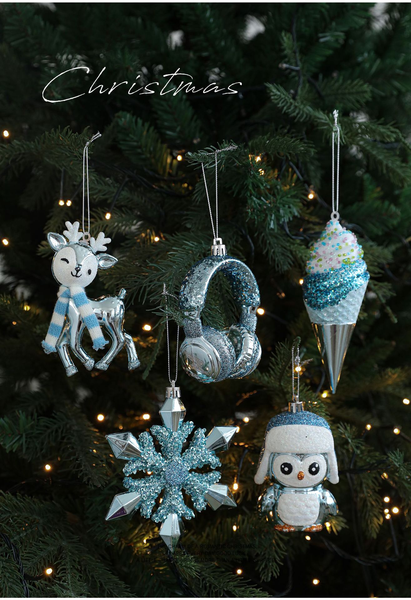 Cross-border blue plastic pendant sticky powder Christmas tree window ornament five-pointed star snowflake cartoon decoration scene layout